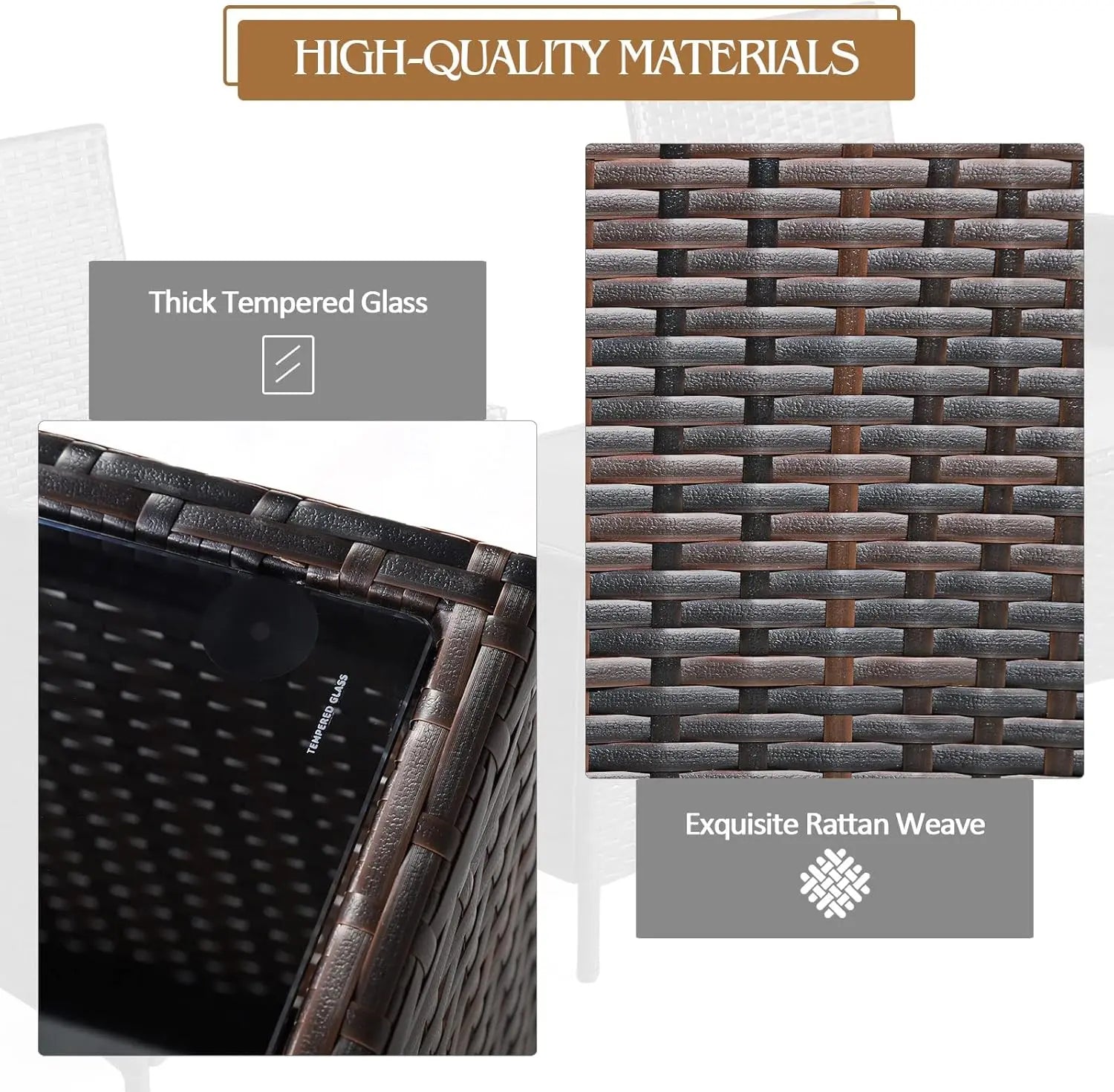 Transform your outdoor space into a cozy retreat with our premium 3-piece patio conversation set. Designed for durability and comfort, this all-weather rattan furniture is perfect for enhancing your garden, backyard, balcony, or poolside area. Experience excellent durability and stability with high-quality PE rattan and a powder-coated steel frame that withstands various weather conditions. Non-slip foot pads on both chairs and table ensure safety and prevent floor scratches, making it ideal for long-term use. Enjoy upgraded comfort with soft, thick sponge-padded cushions that provide extra support. The slightly sloping backrests and curved armrests allow your back and arms to relax naturally, helping you unwind after a busy day. Perfect for lounging with family or friends during leisure moments. The elegant square coffee table features a thick tempered glass top securely fixed by four suckers to avoid movement or drops. It's perfect for holding drinks, snacks, newspapers, or decorative items, adding a touch of sophistication to your setup. Effortless daily cleaning makes maintenance a breeze. The low-maintenance PE rattan can be refreshed by simply washing off dirt with water. Removable zippered cushion covers are easy to wash, while stains on the glass tabletop wipe away quickly with a soft cloth. Suitable for various occasions indoors or outdoors, this versatile set fits seamlessly into any setting. Dimensions: chair - 23" x 22" x 33.5" (L x W x H), coffee table - 16" x 16" x 18" (L x W H). Weight capacity: chair supports up to 395 lbs, coffee table holds up to 165 lbs. Upgrade your outdoor living today! This stylish and functional patio set offers everything you need for relaxation and entertainment. Click 'Add to Cart' now to create your perfect outdoor oasis!