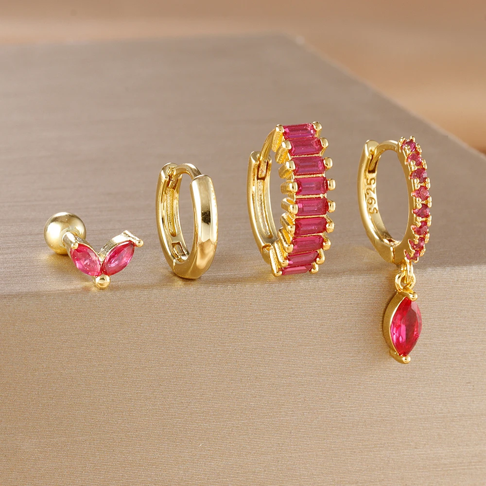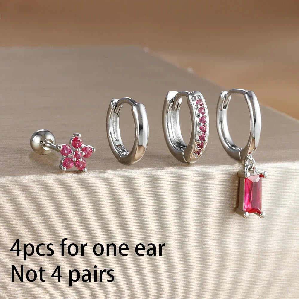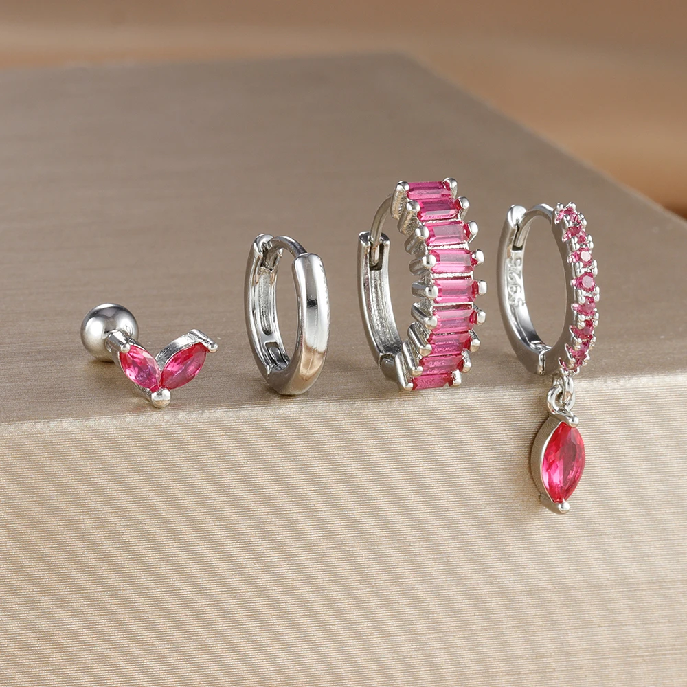 4PCS Rose Red Zircon Stainless Steel Hoop Earrings Set for Women Pendant Water Drop Earring Piercing Jewelry Gift