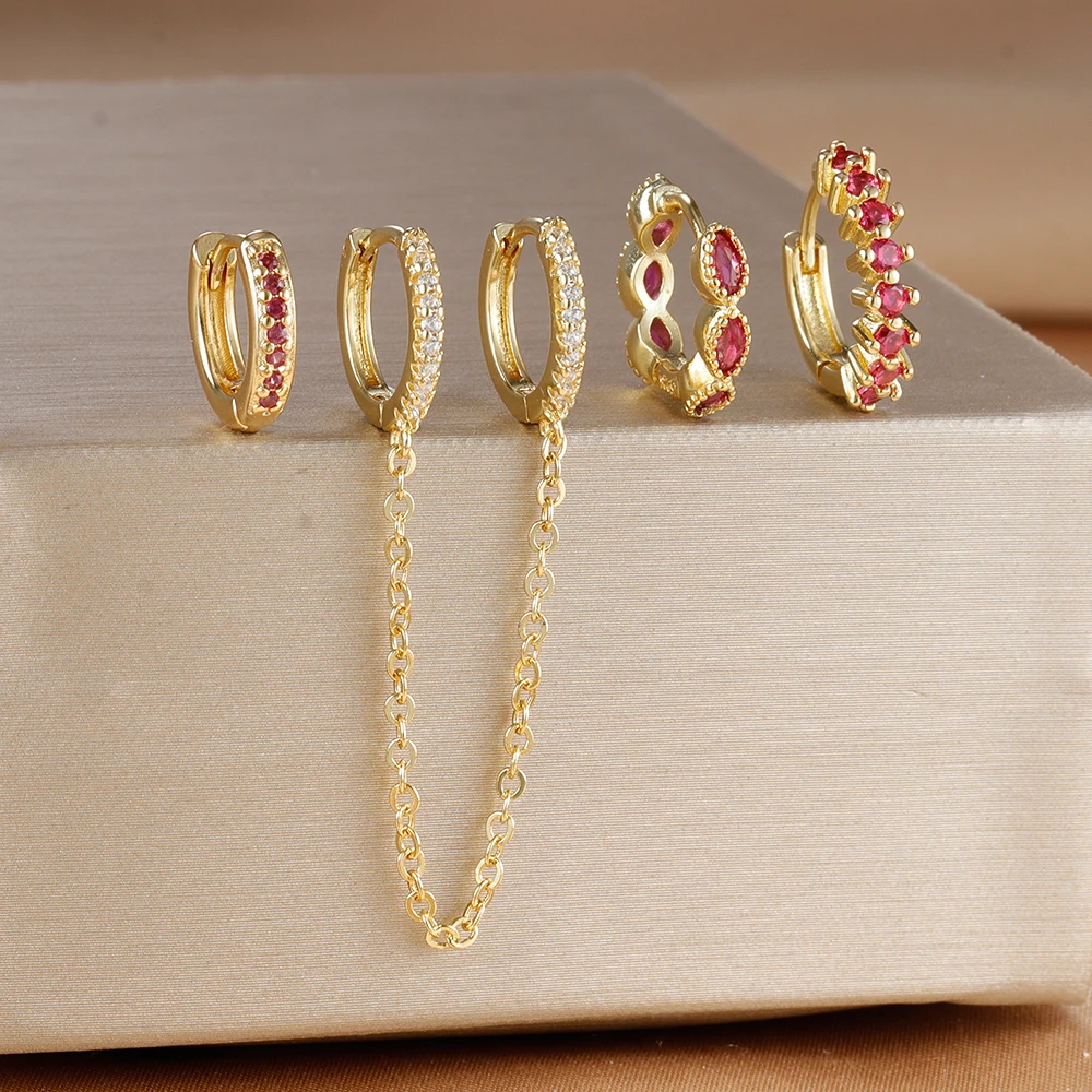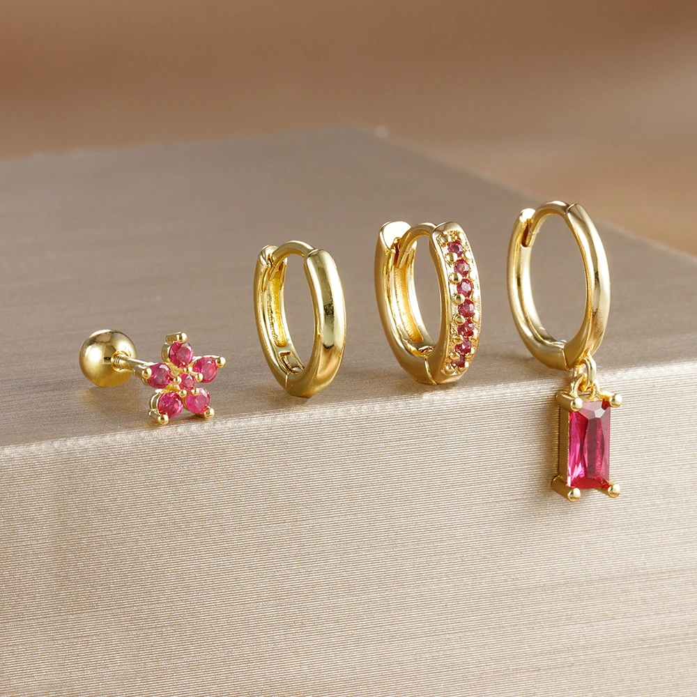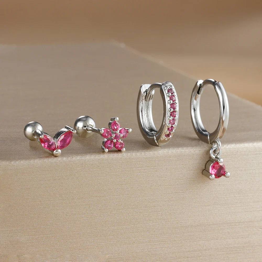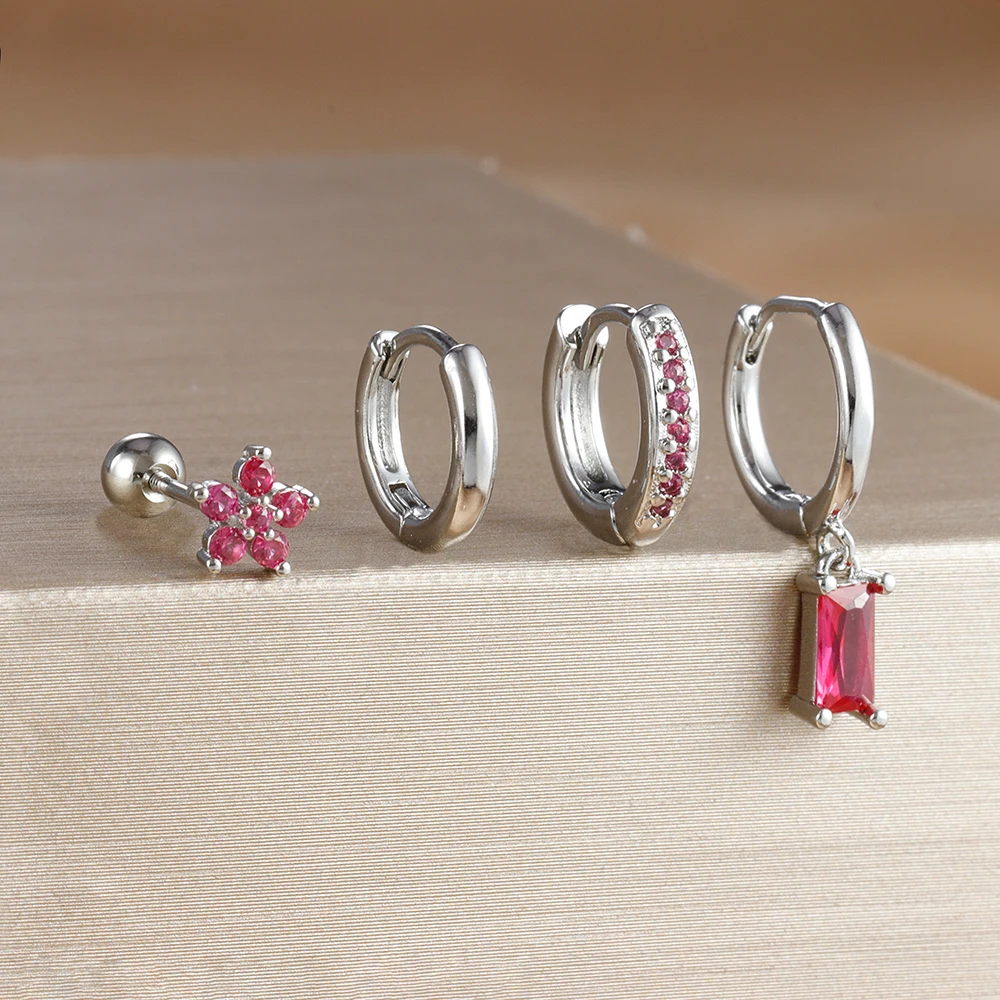 4PCS Rose Red Zircon Stainless Steel Hoop Earrings Set for Women Pendant Water Drop Earring Piercing Jewelry Gift