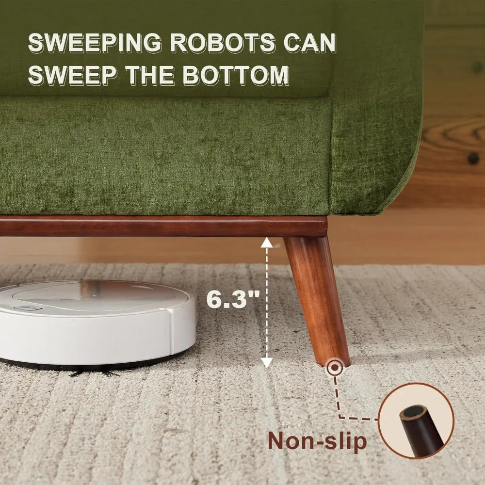 Enhance your living space with this versatile and stylish loveseat sofa. Measuring 77 inches wide, 32 inches deep, and 33 inches high, it's perfectly sized for compact areas like apartments, bedrooms, or small living rooms. The raised legs provide easy cleaning access and include protective spacers to prevent floor scratches. Experience superior comfort with spring-filled cushions combined with high-density foam. This design absorbs daily pressure effectively, ensuring long-lasting durability and a plush seating experience. The sofa comfortably accommodates 2-4 adults, making it ideal for cozy gatherings or everyday relaxation. Practical features add convenience to your home. Side pockets are integrated for storing remotes, books, or magazines within easy reach. Assembly is quick and hassle-free—the sofa ships in one labeled box with clear instructions. You can set it up in under 30 minutes without any tools required. After unpacking, allow the vacuum-packed cushions up to 48 hours to fully expand and regain their original shape for optimal comfort. Crafted from durable chenille fabric in a rich green olive hue, this mid-century modern design blends timeless elegance with contemporary functionality. Perfect for enhancing small spaces or adding a touch of style to any room.