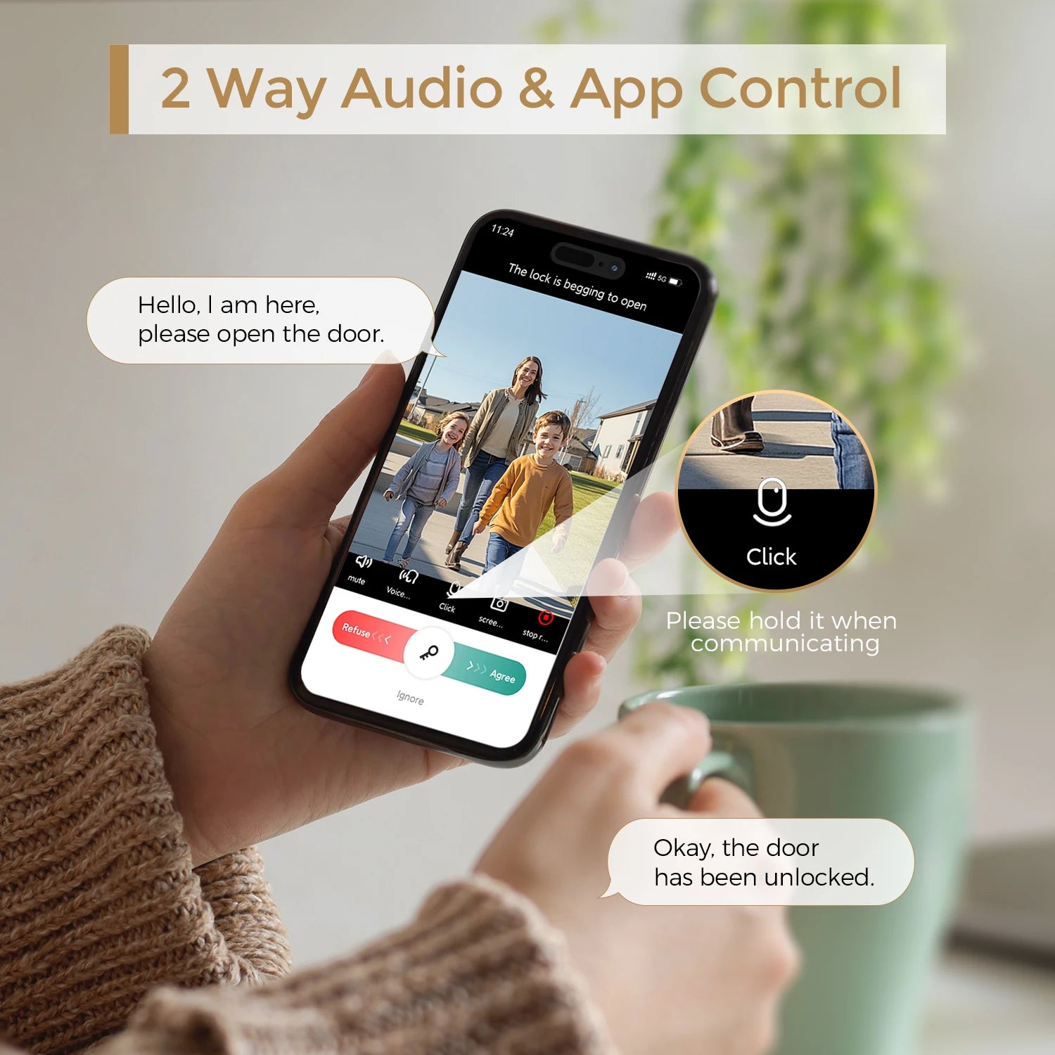 Equipped with a 130° wide-angle lens and built-in two-way microphone, this lock lets you view live video, remotely unlock the door, and communicate with visitors in real time. Simply press the doorbell to wake up the lock and receive instant notifications on your phone.