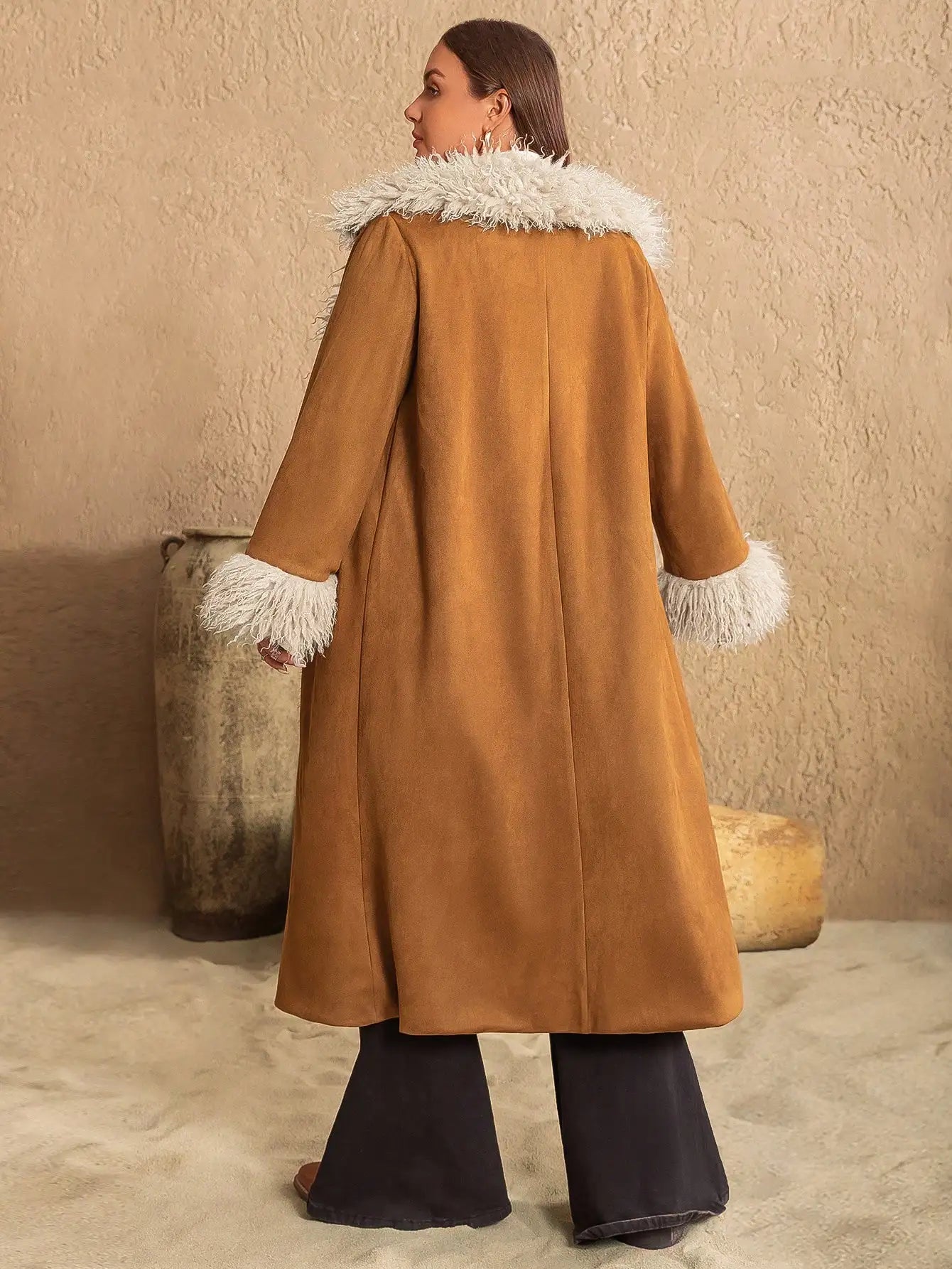 This bohemian-style winter jacket features a rich brown base with luxurious white fuzzy trim along the collar, cuffs, and front opening. Designed for plus size women, it offers a relaxed silhouette with long sleeves and an open-front closure. The soft, warm material makes it ideal for chilly days while maintaining a chic, free-spirited look perfect for casual outings or layered styling.
