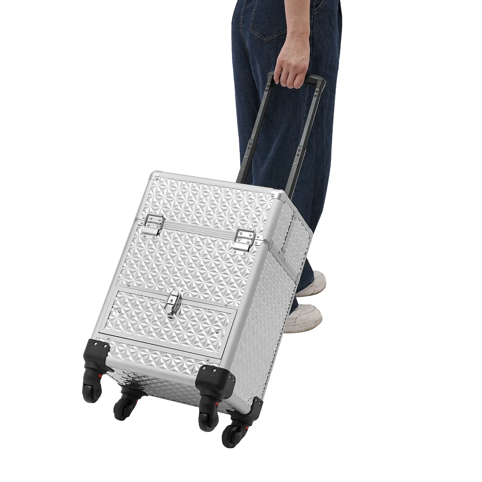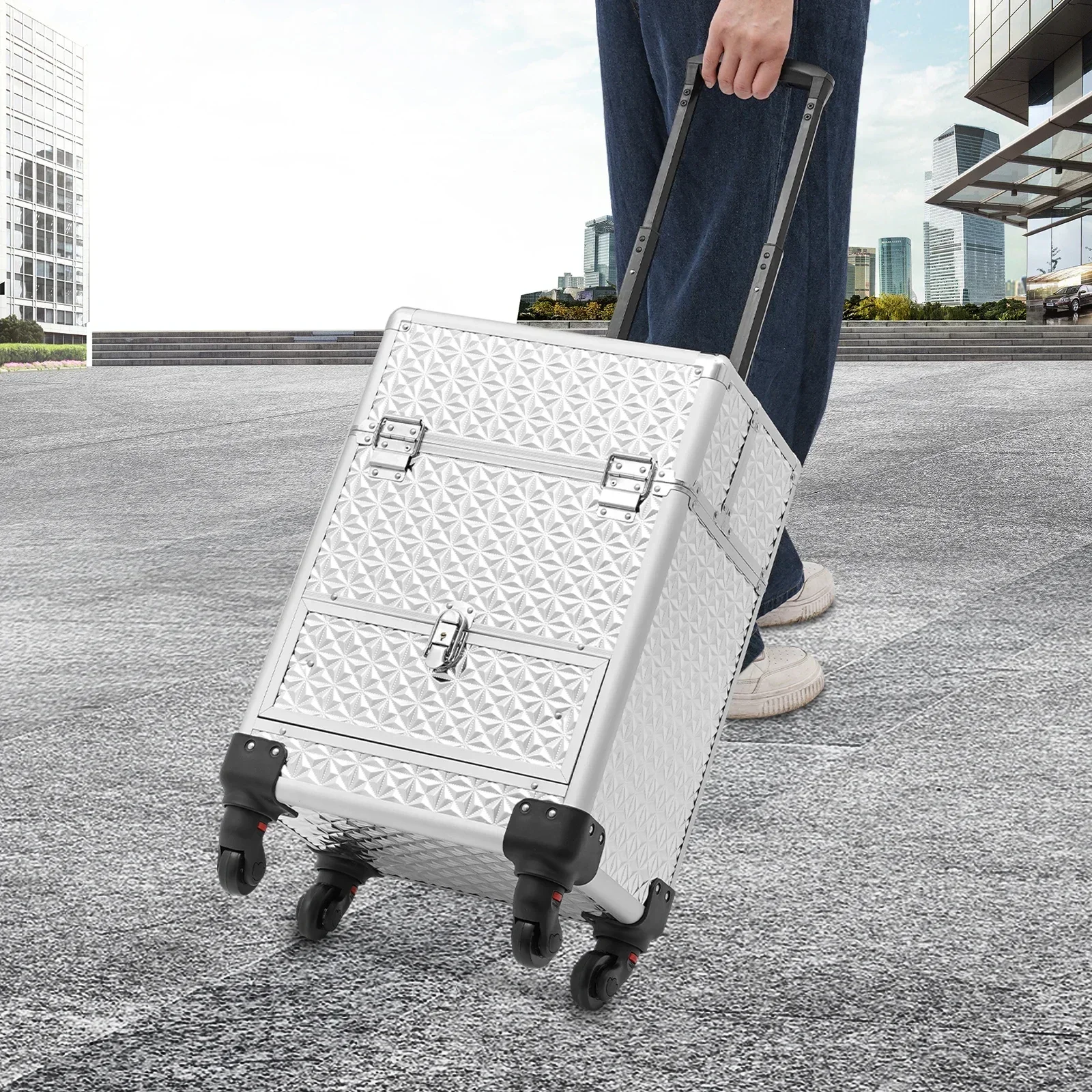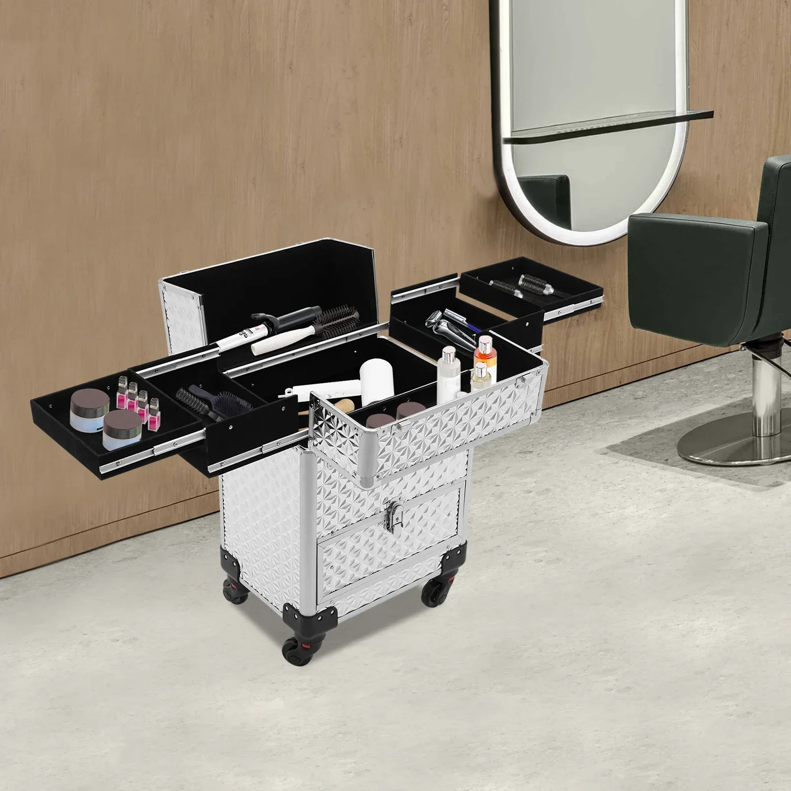 This rolling makeup train case can be widely used by hair stylists, pet groomers, makeup artists, and so on for storing scissors, makeup, jewelry, combs, and other items. In addition, it is also very suitable for you to store tools or daily necessities when you go out.
