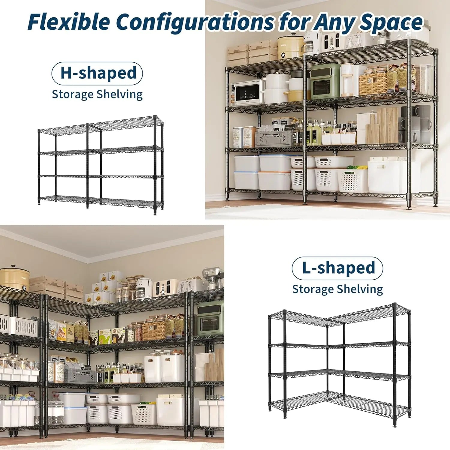 --- Effortless Adjustable Garage Shelves: Our pantry shelves can be adjusted in height freely according to your needs, move the clips to adjust each shelf height in seconds to fit large bins, kitchen appliances, or pantry items. This flexible wire metal shelving unit makes it easy to organize, so everything in your space finds its place.