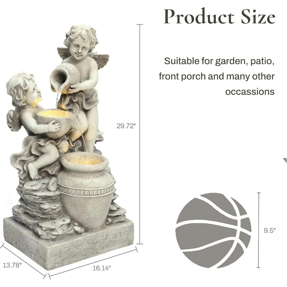 - Perfect Dimensions: Measuring 29.72" L x 16.14" W x 29.72" H, this angel waterfall fountain indoor and outdoor is an ideal size for both spacious gardens and compact patios.