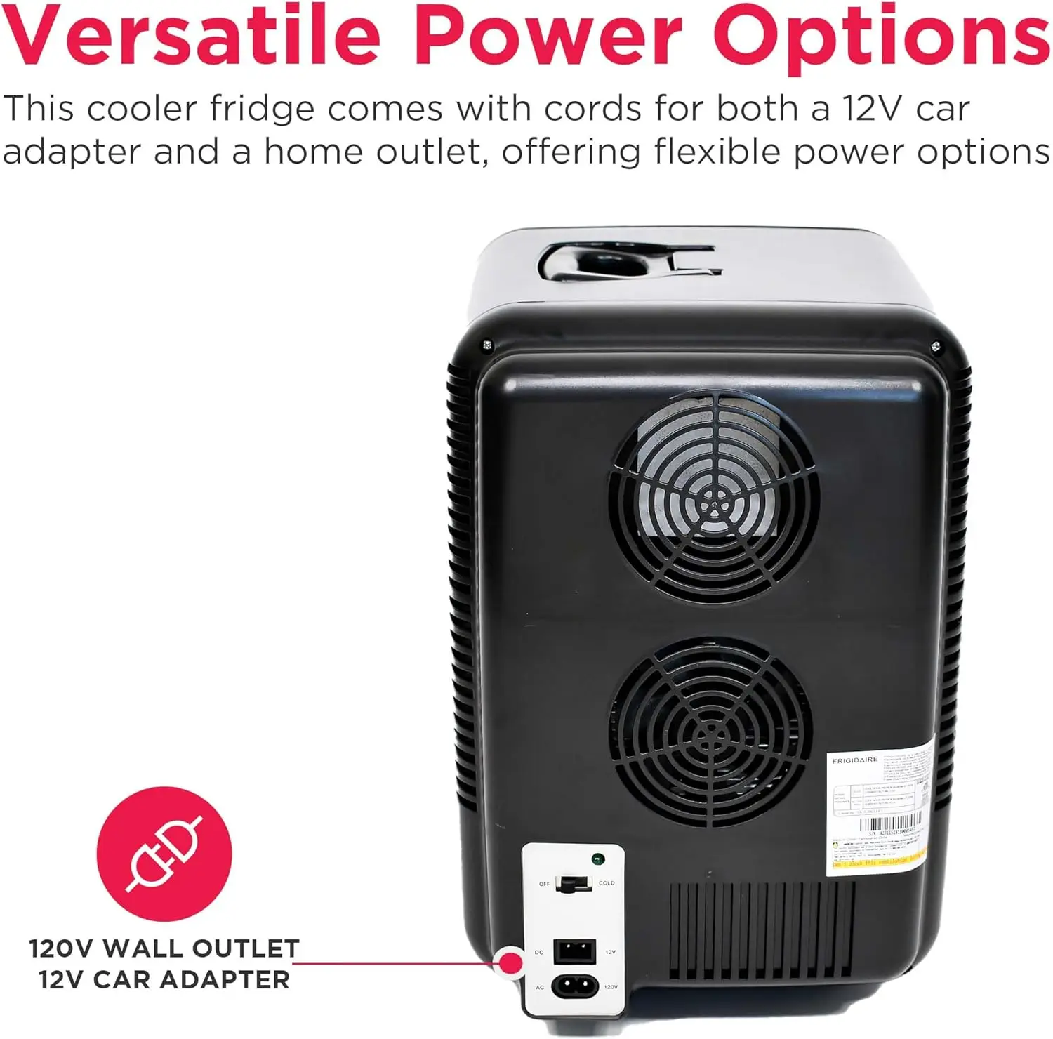 Versatile Power Options - Equipped with cords for both a 12V car adapter and a home outlet, this cooler fridge offers flexible power options, ensuring you can use it wherever you go.