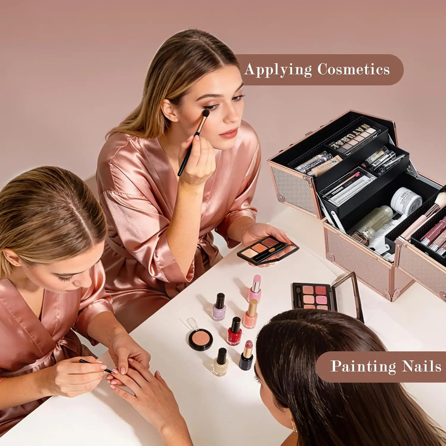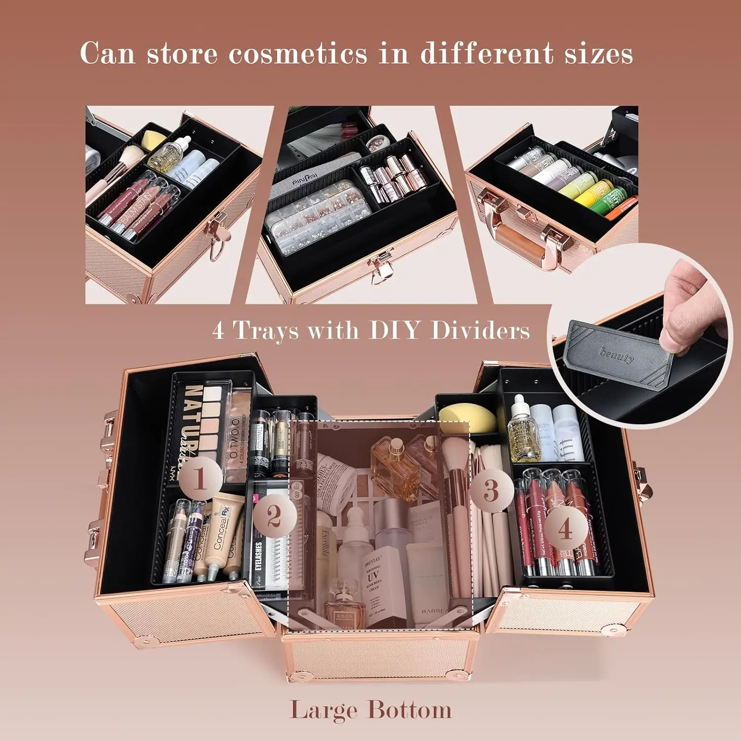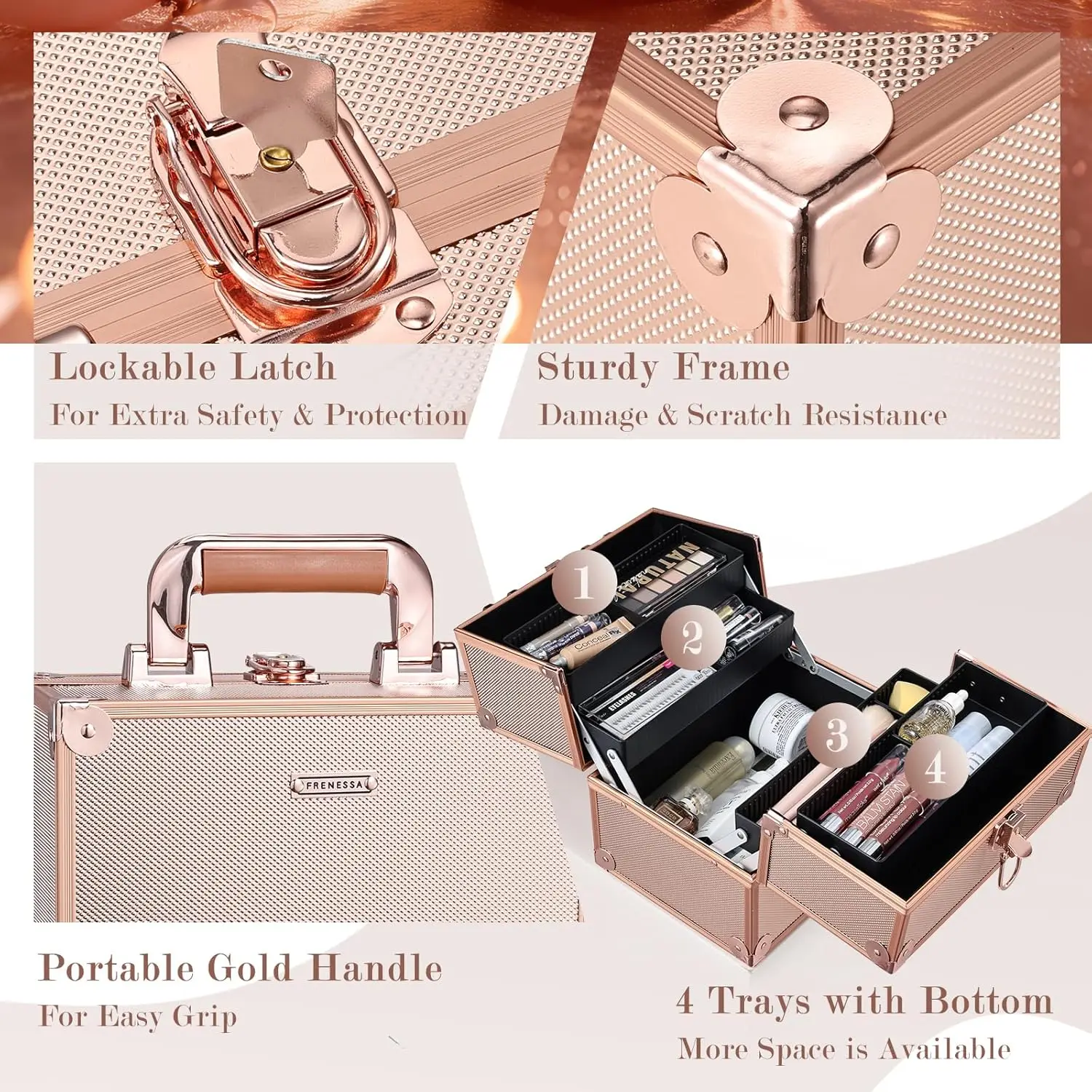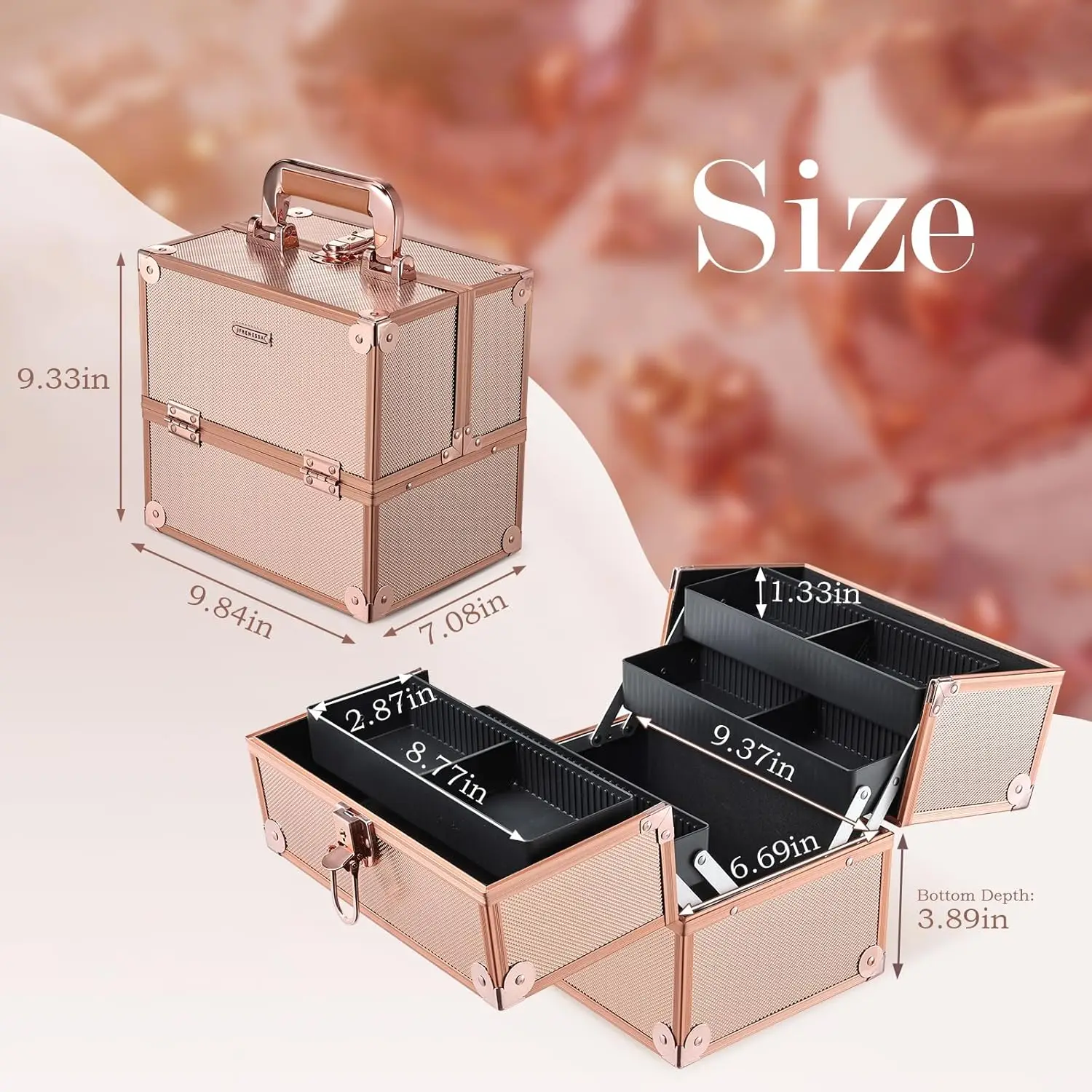 Portable Makeup Train Case with Dividers & Lock, Rose Gold Travel Cosmetic Organizer for Artists, Nail, Sewing Storage