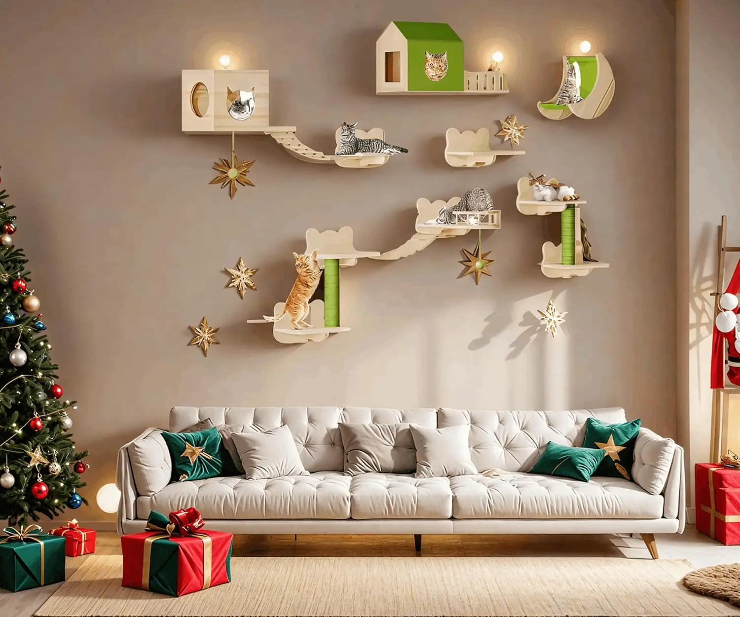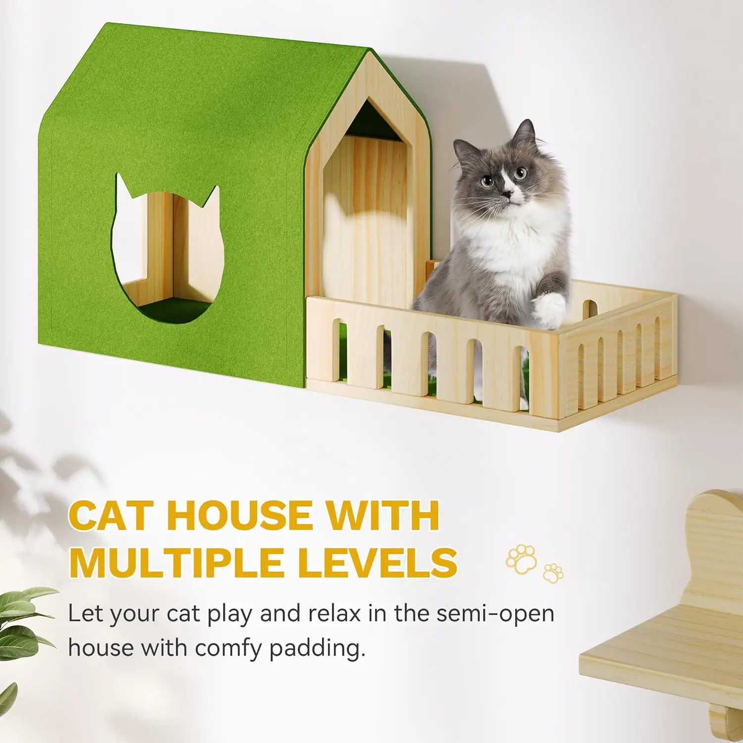 Transform your home into a feline paradise with our versatile cat wall furniture set. This comprehensive collection includes 14 pieces designed to enhance your cat's playtime and comfort while saving valuable space in your living area. Key Features: - Versatile Activity Options: Our multifunctional shelves provide various levels for climbing, perching, scratching, and hiding. Your cat can explore different heights and activities, promoting exercise and mental stimulation throughout the day. - Space-Saving Design: Perfect for small apartments or modern homes, these wall-mounted shelves maximize vertical space. Your cat can climb and jump freely without cluttering your floor area, creating an organized environment for both you and your pet. - Natural Solid Wood Construction: Crafted from durable pine wood, these shelves offer long-lasting safety and stability. Smooth surfaces prevent splinters or injuries, while sturdy construction supports large cats comfortably during active play sessions. - Distinctive Themed Elements: Enjoy unique cat-shaped steps and hidden houses that add playful charm to any room. These design features create cozy resting spots that capture your feline companion's personality while blending seamlessly with home decor. - Easy Installation Process: Each set comes complete with all necessary hardware and clear step-by-step instructions. You can mount these shelves on any wall type quickly, allowing you to set up a complete cat activity center without professional help. Benefits for Your Cat: Our wall shelves encourage natural climbing instincts, reduce boredom-related behaviors like excessive scratching on furniture, and provide safe elevated perches for observation. The variety of components including steps, bridge ladders, and scratching posts ensures continuous engagement whether your cat prefers active play or quiet relaxation. Ideal For: This set is perfect for multi-cat households or owners of large breeds seeking durable solutions. It helps create vertical territory that reduces conflicts among pets by offering multiple resting areas at different heights. The green accents add visual appeal while maintaining a natural aesthetic that complements various interior styles. Customer Satisfaction: We prioritize quality materials and thoughtful design to deliver products that enhance both feline well-being and home aesthetics. Our shelves are tested for stability and comfort, ensuring they meet the needs of active cats while providing peace of mind for pet owners.