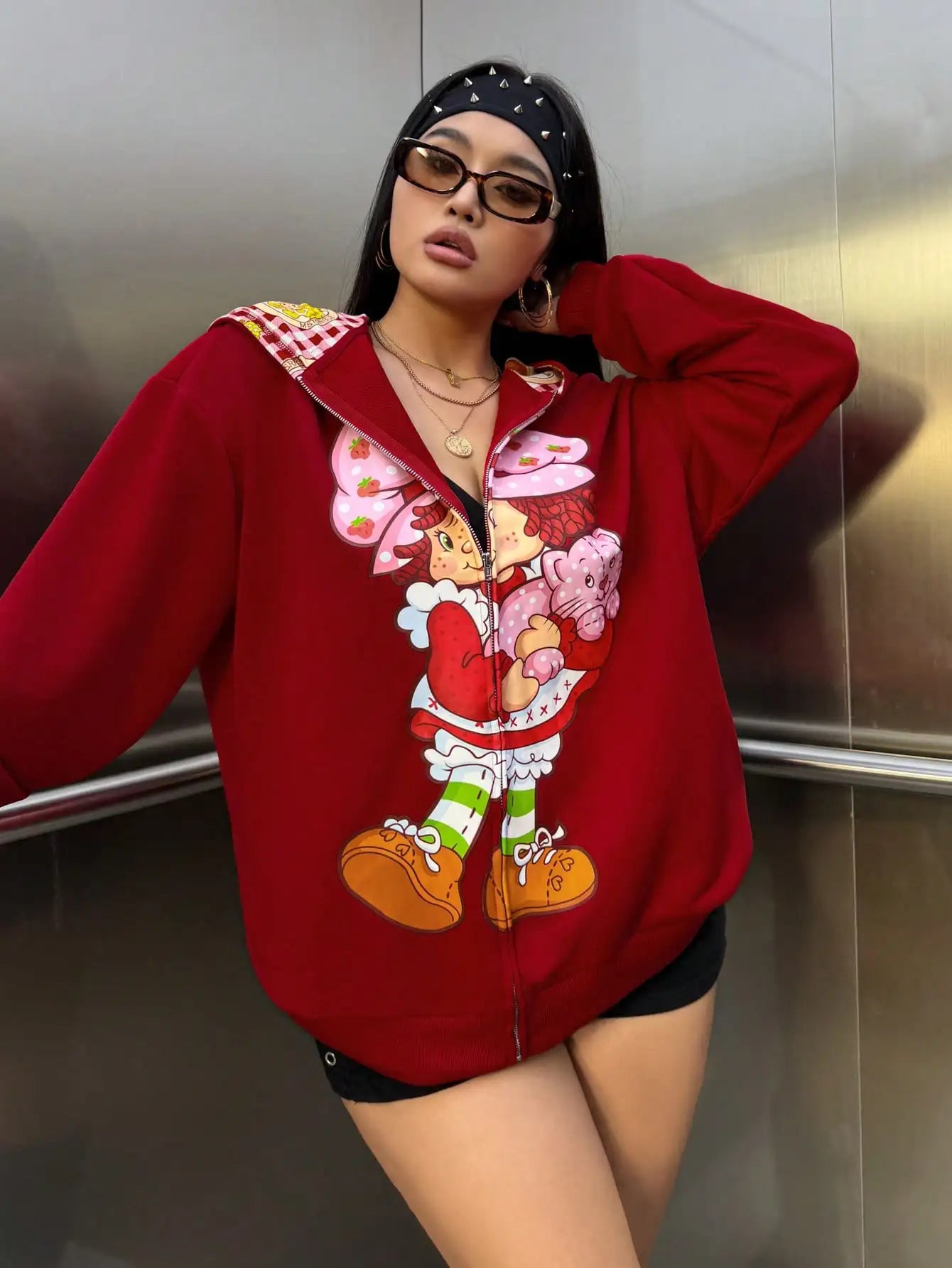 Strawberry Shortcake Cartoon Print Zip-Up Hoodie for Women, Loose Fit Drop Shoulder, Spring Autumn Casual