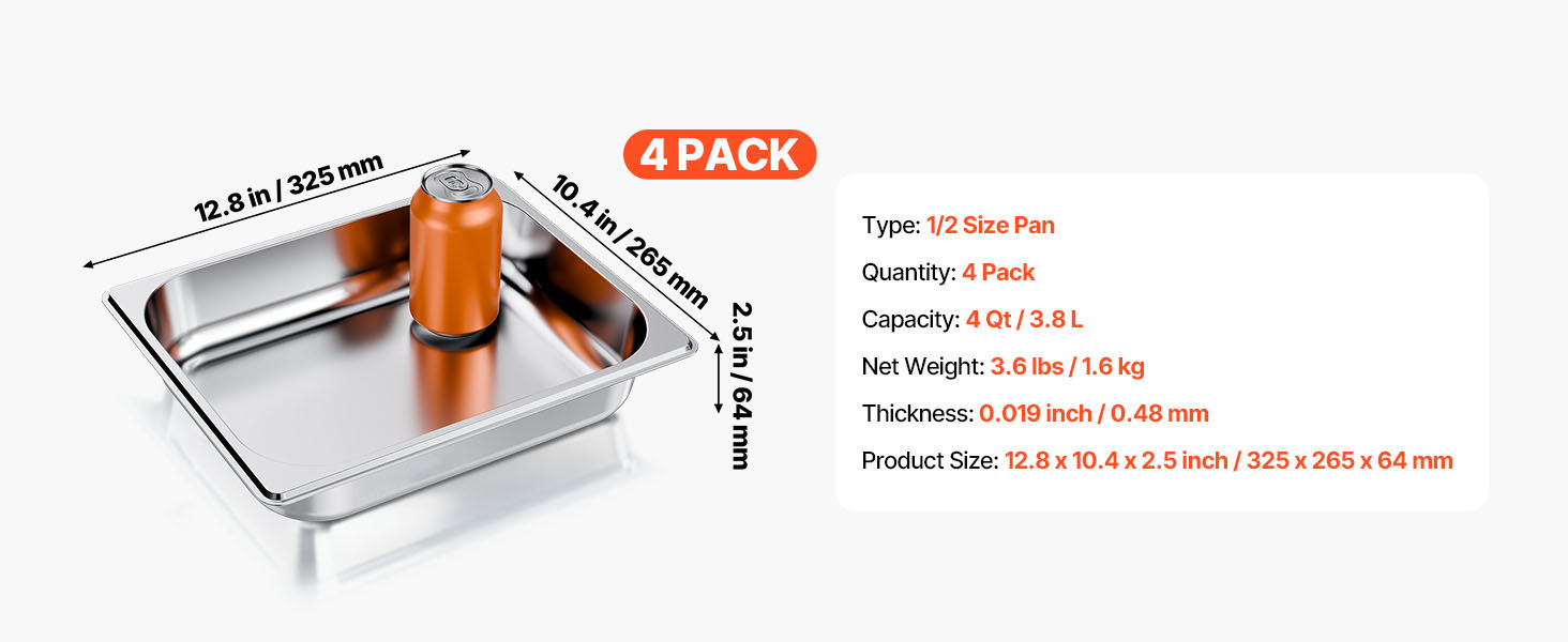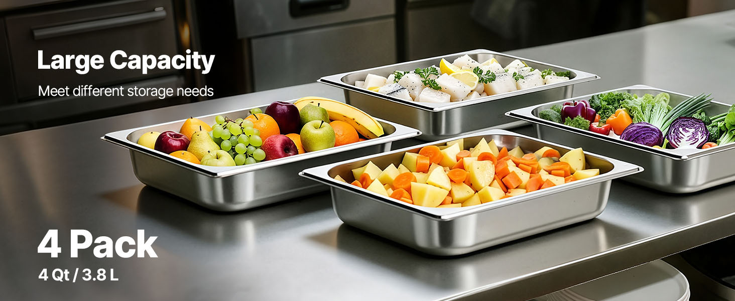 Generous Food Storage: This set of 1/2 size stainless steel pans provides a total capacity, making it suitable for daily cooking and food preparation. Perfect for cooking, storing, and serving a variety of items such as meats, vegetables, fruits, ice cream, and more.