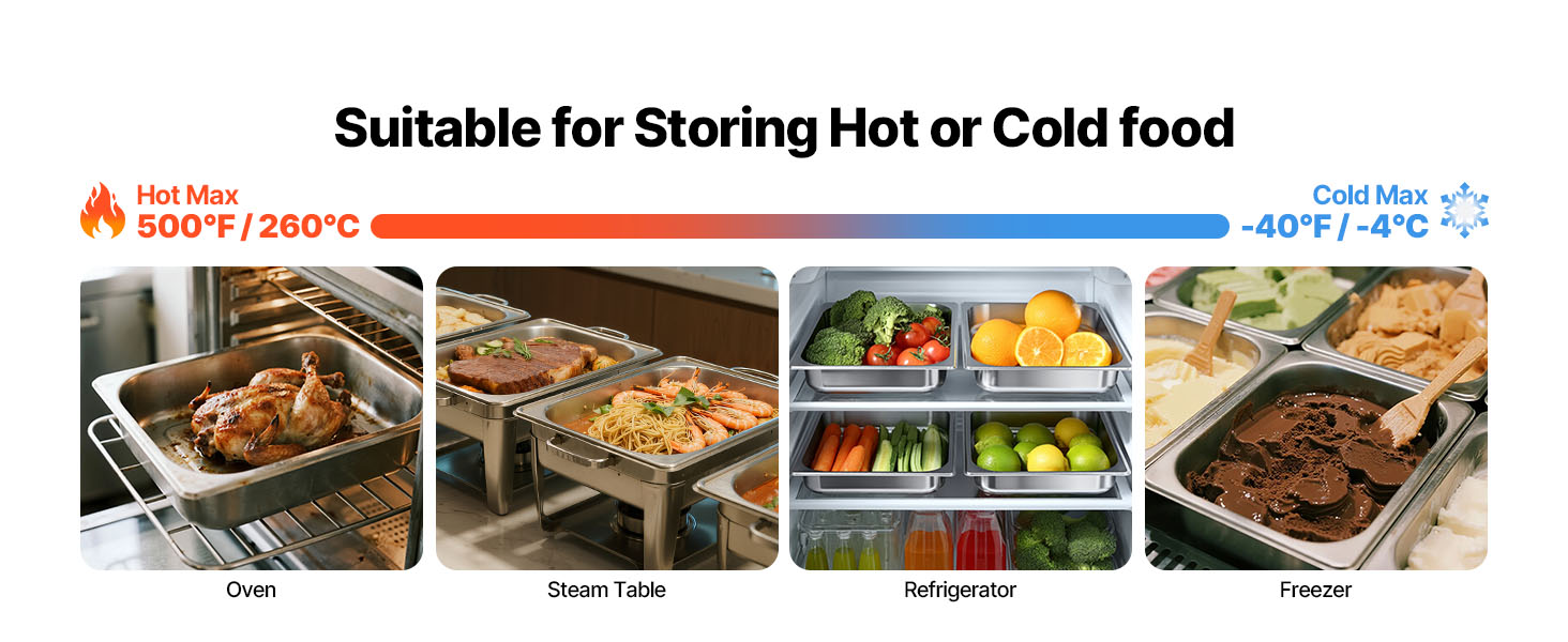 Durable Stainless Steel Construction: This stainless steel hotel pan is made from 22-gauge SS201 stainless steel, offering exceptional durability and resistance to rust. Designed to accommodate both hot and cold foods, it can endure a wide temperature range from -40℉ to 500℉ (-4℃ to 260℃). Compatible with high-temperature commercial dishwashers, as well as refrigerators and freezers.