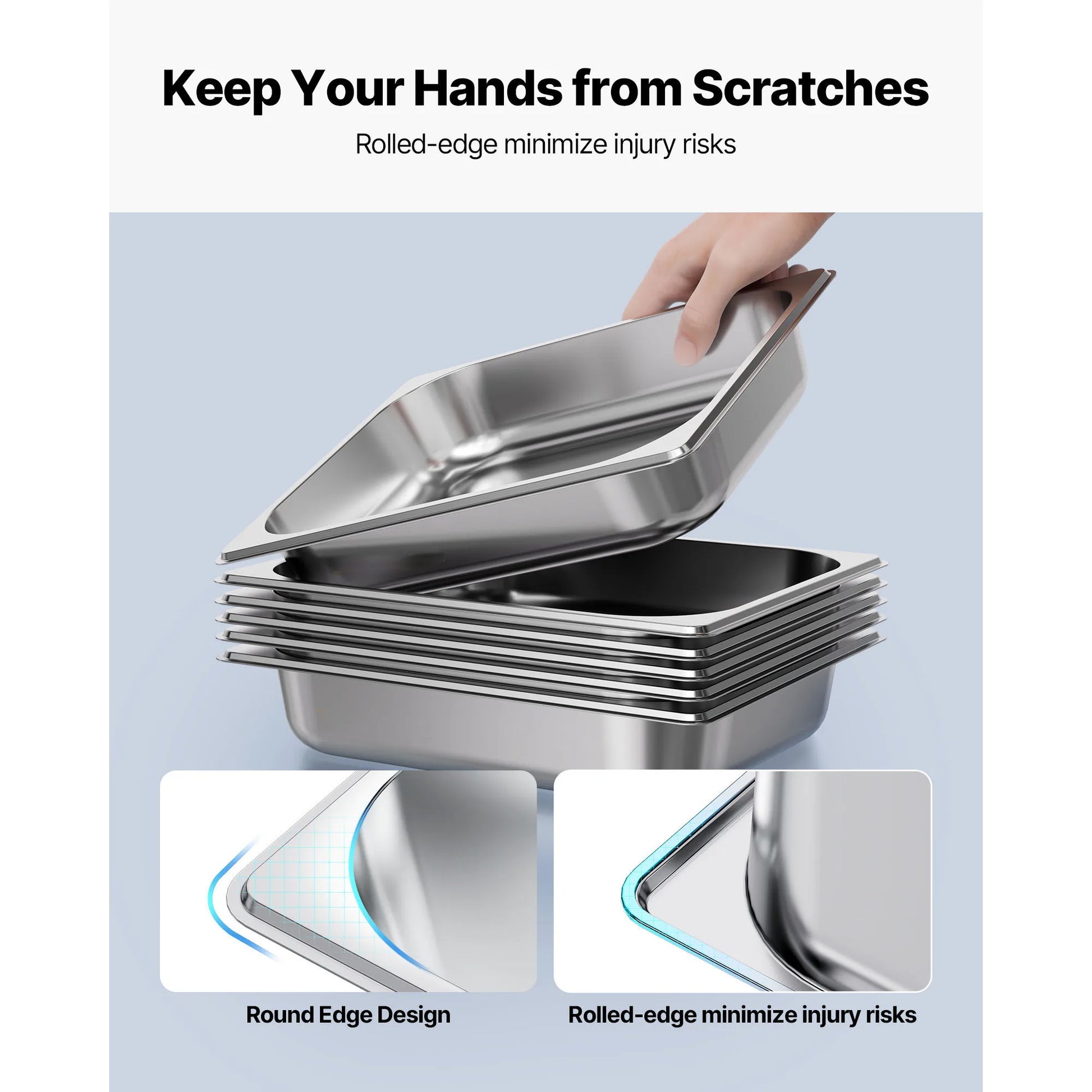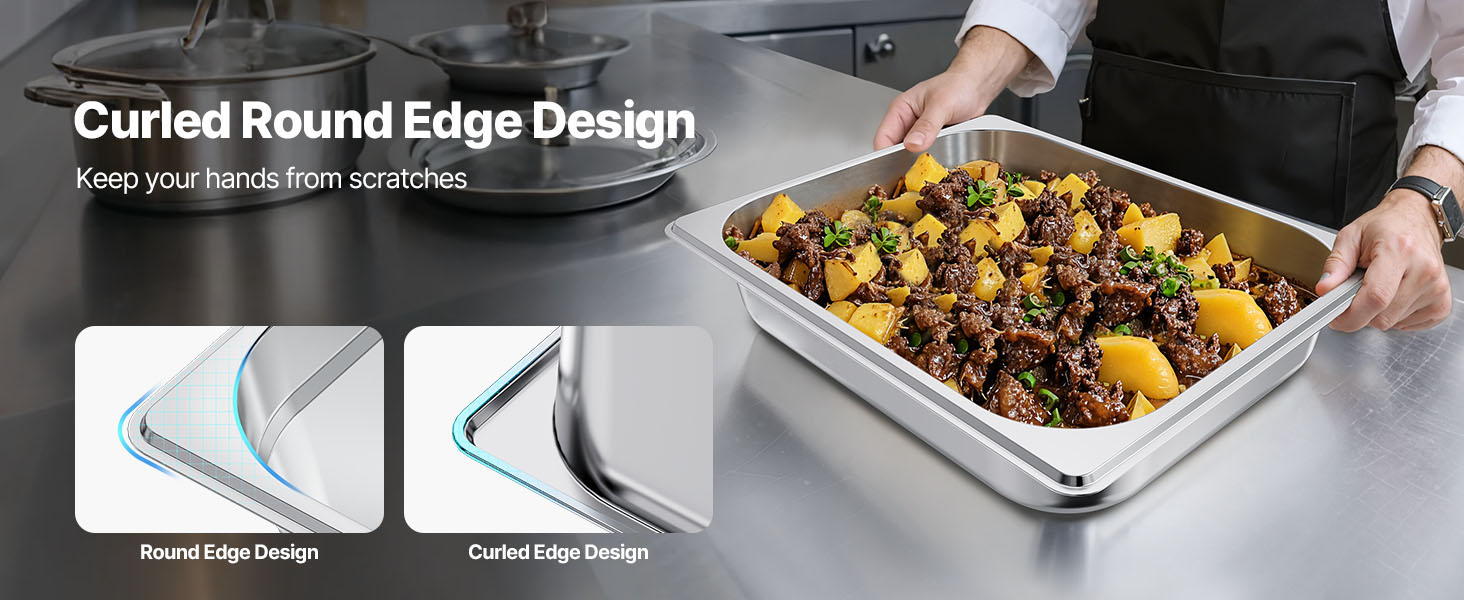 Seamless Design: This stainless steel food pan is crafted with a one-piece construction and rounded edges, ensuring safe handling without the risk of scratches during use or cleaning. Its matte finish provides a sleek and professional appearance, making it ideal for catering events, buffet setups, and commercial kitchen environments.