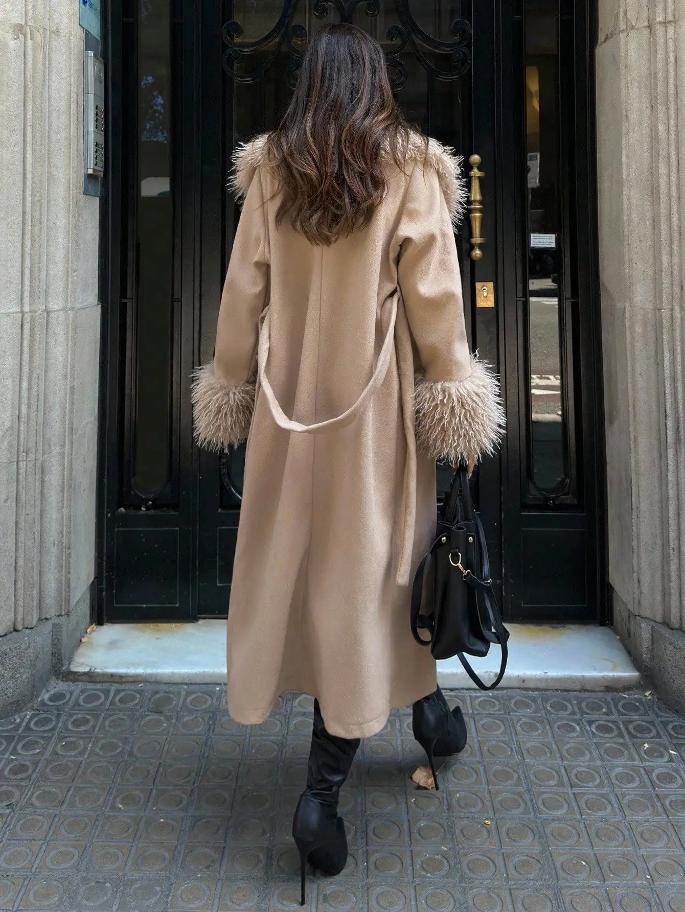Women's Faux Fur Trim Wool Blend Coat, Bohemian Style Long Jacket for Fall Winter
